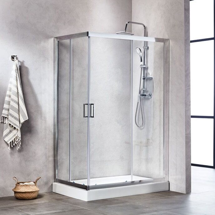 Βαρέως τύπου καμπίνα ντους, με δύο σταθερά φύλλα και δύο συρόμενες πόρτες.> Γωνιακής εισόδου με 2 σταθερά φύλλα & 2 συρόμενες πόρτες> Τετράγωνο προφίλ χρωμέ> Μαγνnτικό κλείσιμο> Κρύσταλλο ασφαλείας 5mm> Προσυναρμολογnμένες> Δυνατότnτα προέκτασnς ανά πλευρά με extra προφίλΚΩΔΙΚΟ..